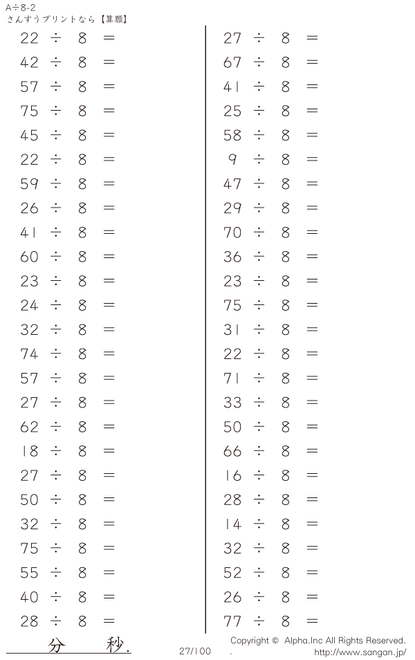 A÷8のPDFプリント あまりあり 割り切れない [問題]027/100