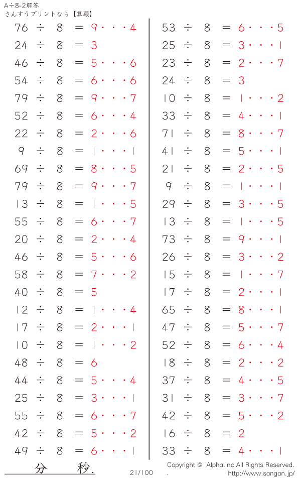 A÷8のPDFプリント あまりあり 割り切れない [解答]021/100
