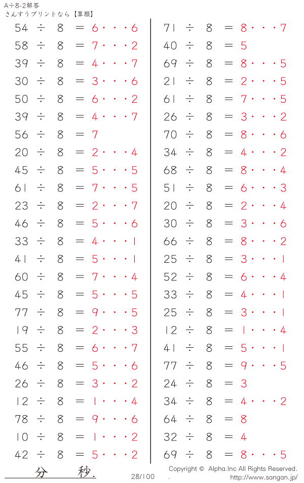 A÷8のPDFプリント あまりあり 割り切れない [解答]028/100