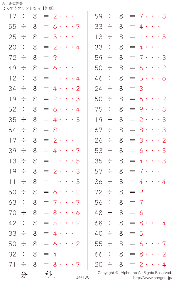 A÷8のPDFプリント あまりあり 割り切れない [解答]034/100
