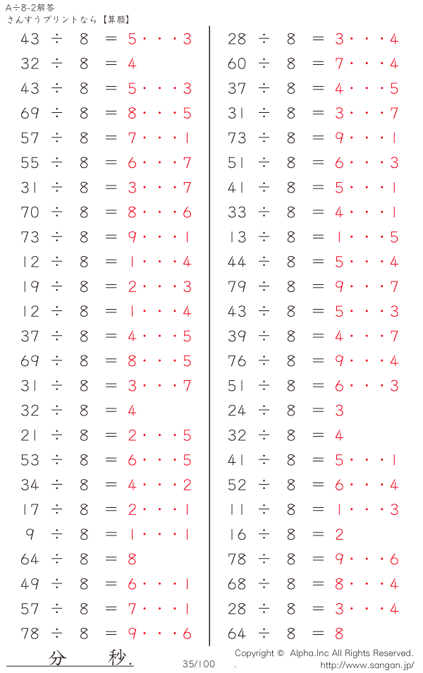 A÷8のPDFプリント あまりあり 割り切れない [解答]035/100