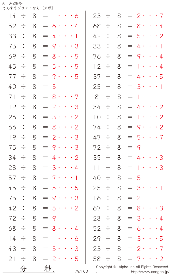 A÷8のPDFプリント あまりあり 割り切れない [解答]079/100