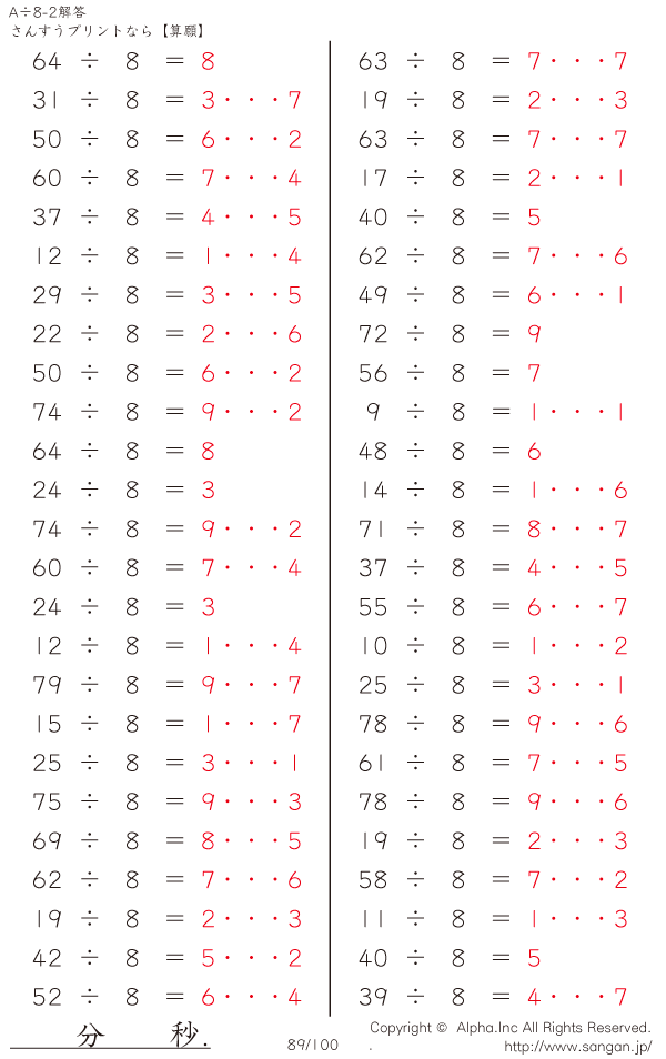 A÷8のPDFプリント あまりあり 割り切れない [解答]089/100