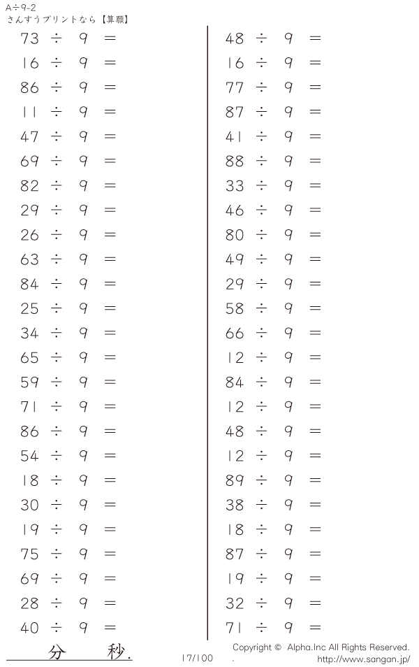 A÷9のPDFプリント あまりあり 割り切れない [問題]017/100
