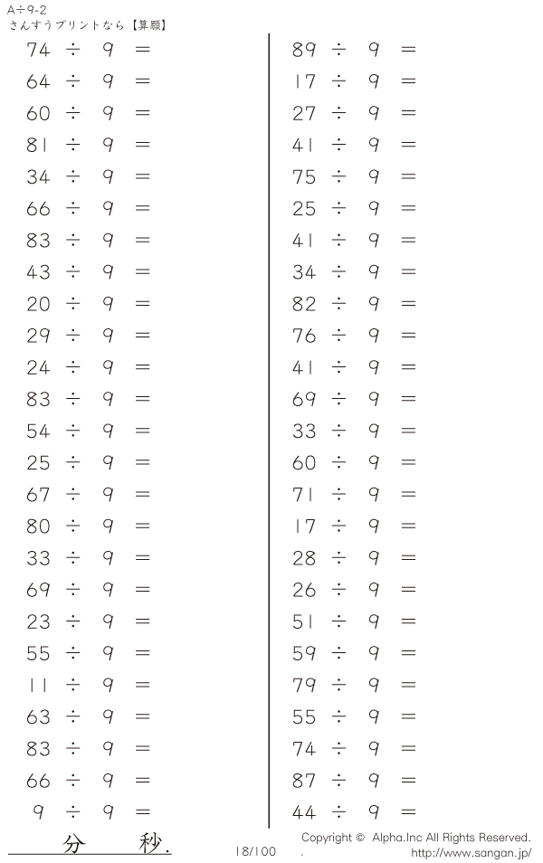 A÷9のPDFプリント あまりあり 割り切れない [問題]018/100