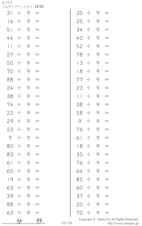A÷9のPDFプリント あまりあり 割り切れない [問題]022/100