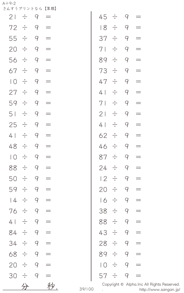 A÷9のPDFプリント あまりあり 割り切れない [問題]039/100