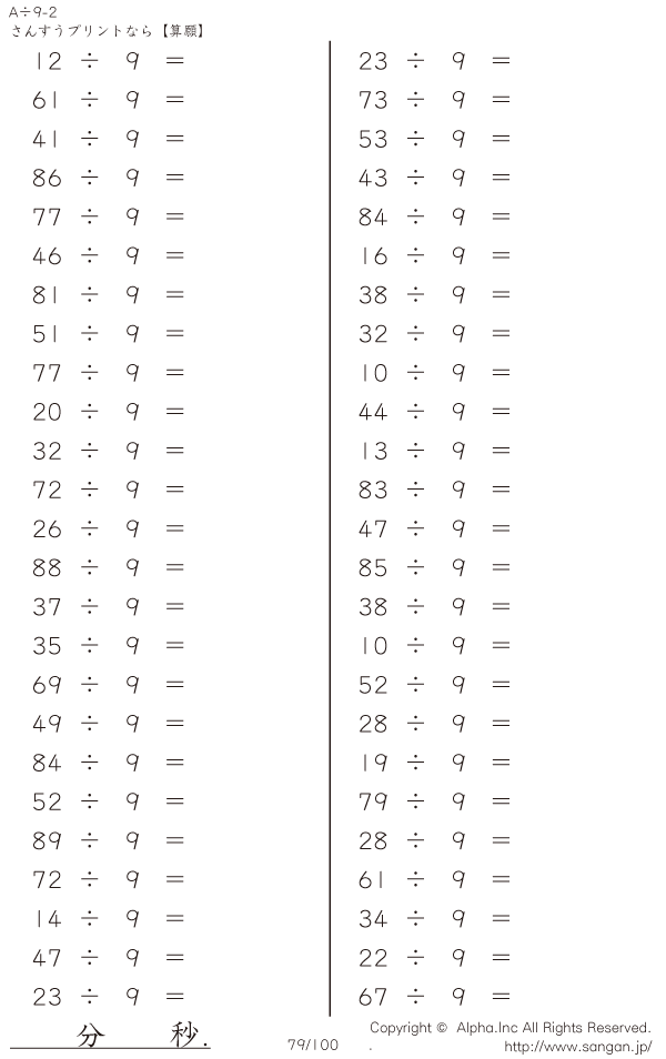 A÷9のPDFプリント あまりあり 割り切れない [問題]079/100