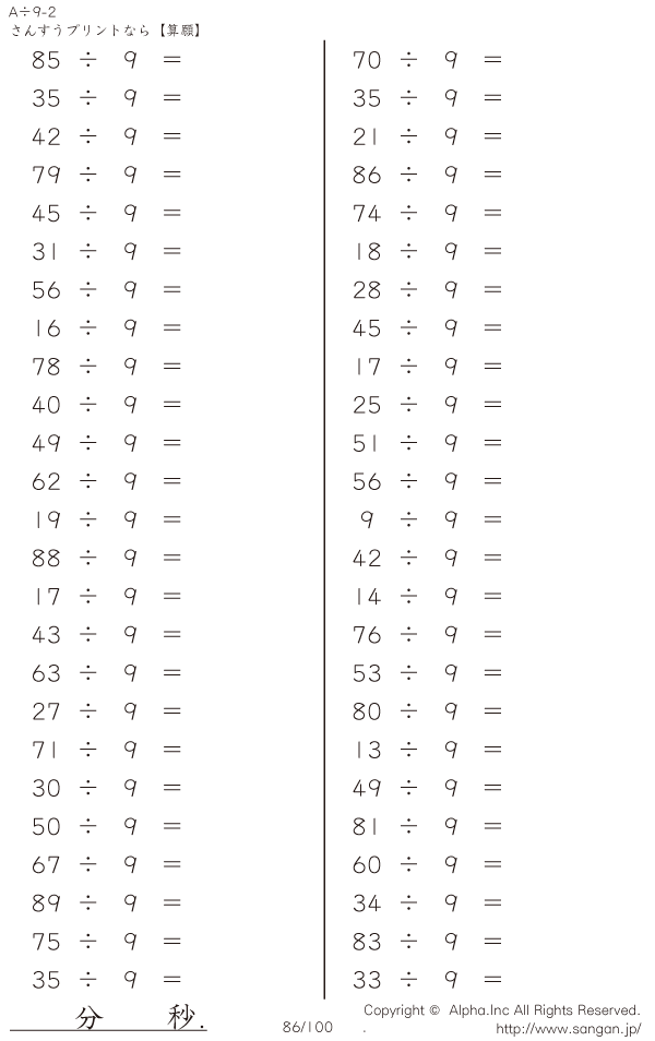 A÷9のPDFプリント あまりあり 割り切れない [問題]086/100