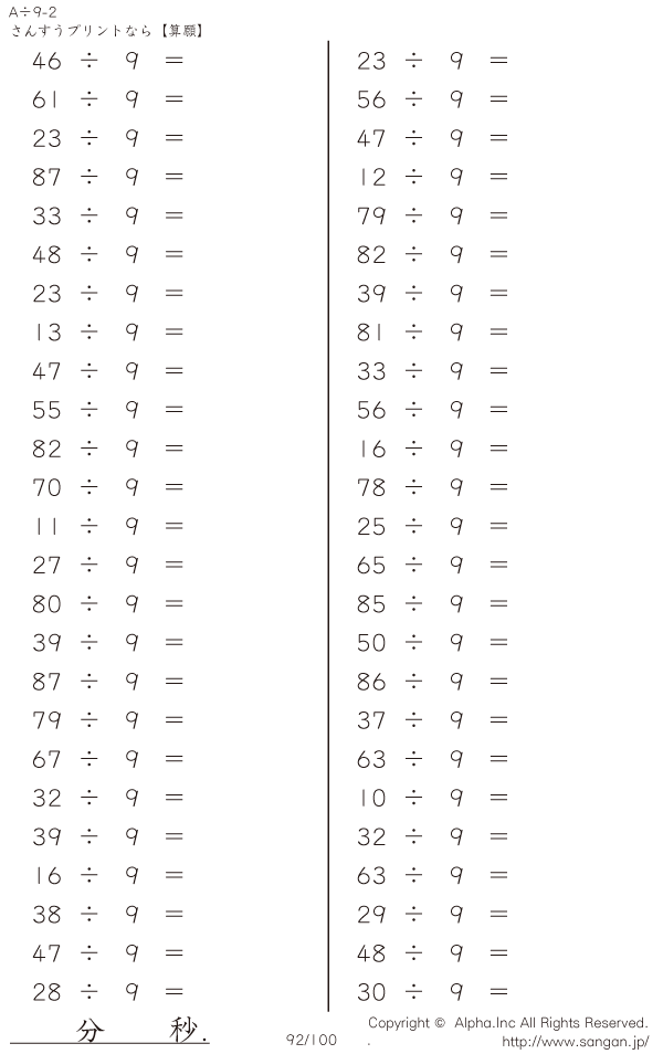 A÷9のPDFプリント あまりあり 割り切れない [問題]092/100
