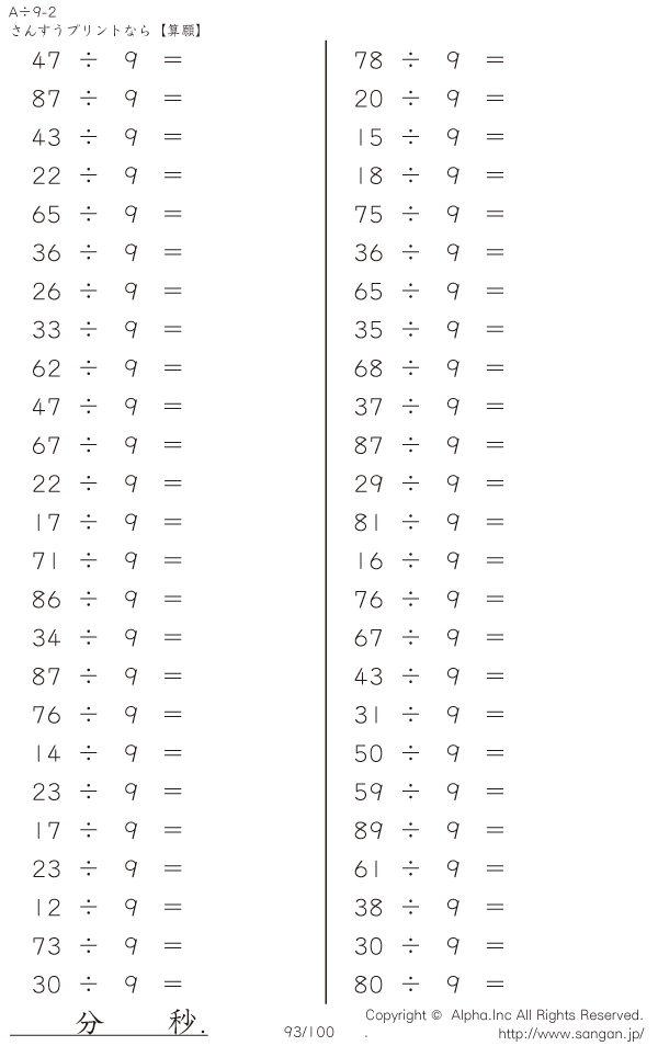 A÷9のPDFプリント あまりあり 割り切れない [問題]093/100
