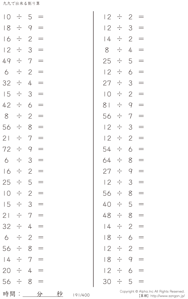 上記のボタンから「九九で出来る割り算」の算数数学ドリル・計算ドリル(PDFプリント)がダウンロードできます。個人利用は無料です(家庭以外での配布は有料です)。