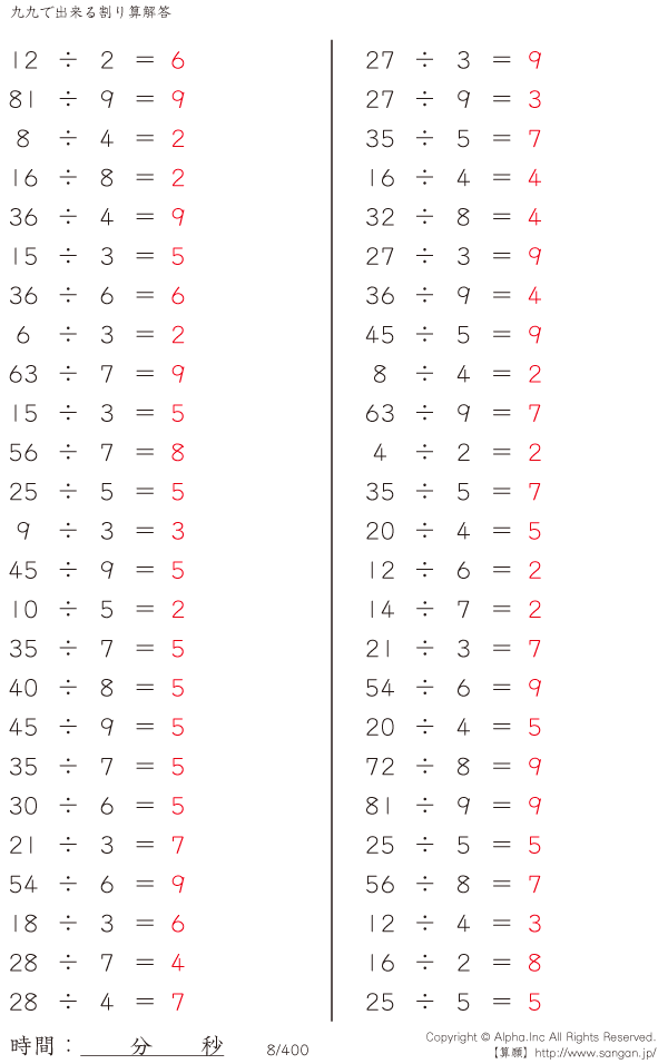 上記のボタンから「九九で出来る割り算」の算数数学ドリル・計算ドリル(PDFプリント)がダウンロードできます。個人利用は無料です(家庭以外での配布は有料です)。