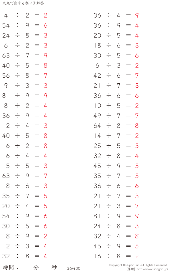 上記のボタンから「九九で出来る割り算」の算数数学ドリル・計算ドリル(PDFプリント)がダウンロードできます。個人利用は無料です(家庭以外での配布は有料です)。