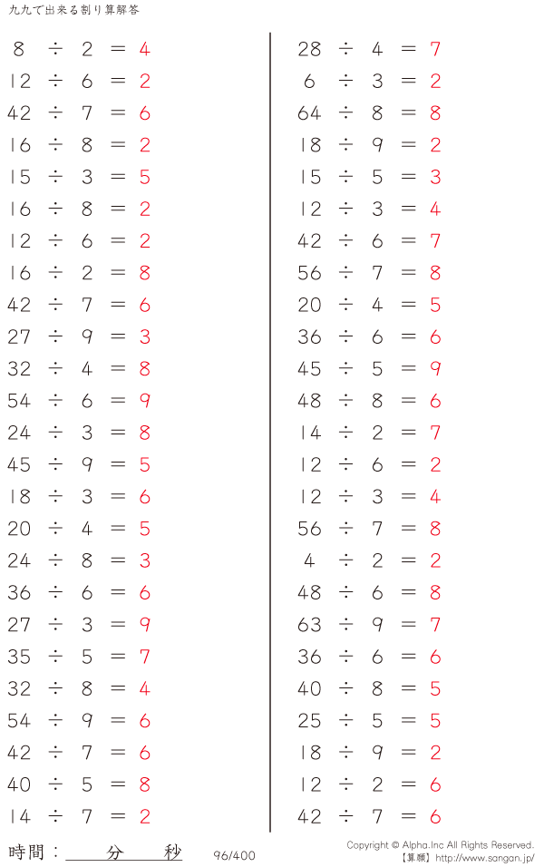 上記のボタンから「九九で出来る割り算」の算数数学ドリル・計算ドリル(PDFプリント)がダウンロードできます。個人利用は無料です(家庭以外での配布は有料です)。