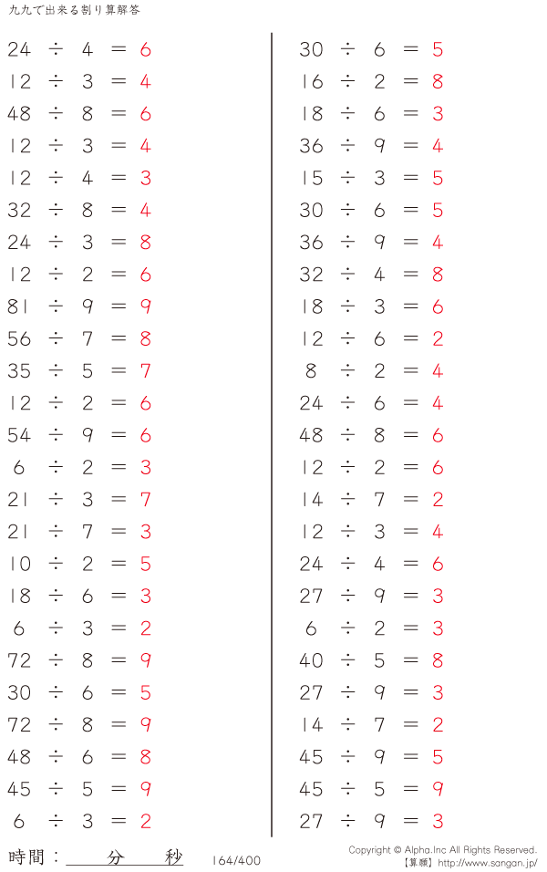 上記のボタンから「九九で出来る割り算」の算数数学ドリル・計算ドリル(PDFプリント)がダウンロードできます。個人利用は無料です(家庭以外での配布は有料です)。