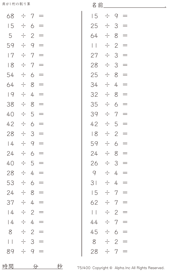 上記のボタンから「商が1桁の割り算」の算数数学ドリル・計算ドリル(PDFプリント)がダウンロードできます。個人利用は無料です(家庭以外での配布は有料です)。