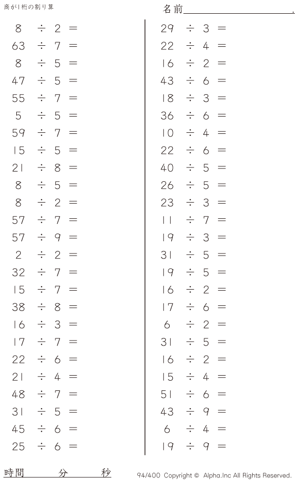上記のボタンから「商が1桁の割り算」の算数数学ドリル・計算ドリル(PDFプリント)がダウンロードできます。個人利用は無料です(家庭以外での配布は有料です)。