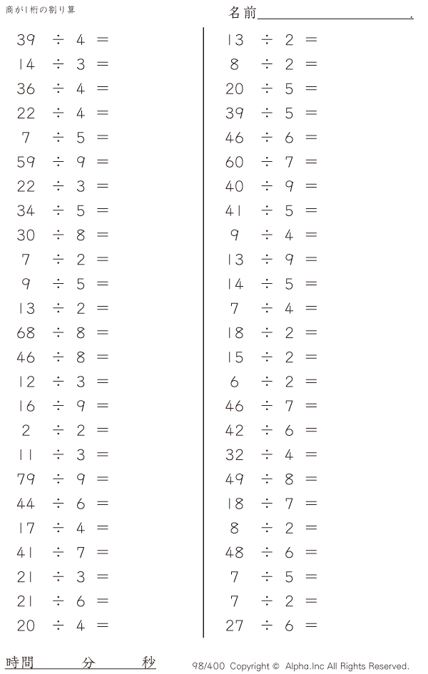 上記のボタンから「商が1桁の割り算」の算数数学ドリル・計算ドリル(PDFプリント)がダウンロードできます。個人利用は無料です(家庭以外での配布は有料です)。