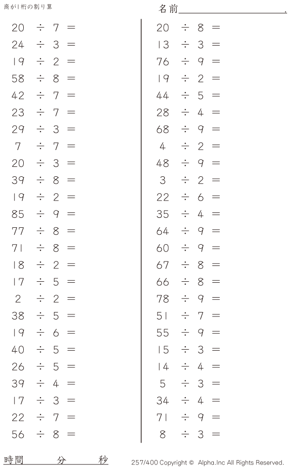 上記のボタンから「商が1桁の割り算」の算数数学ドリル・計算ドリル(PDFプリント)がダウンロードできます。個人利用は無料です(家庭以外での配布は有料です)。