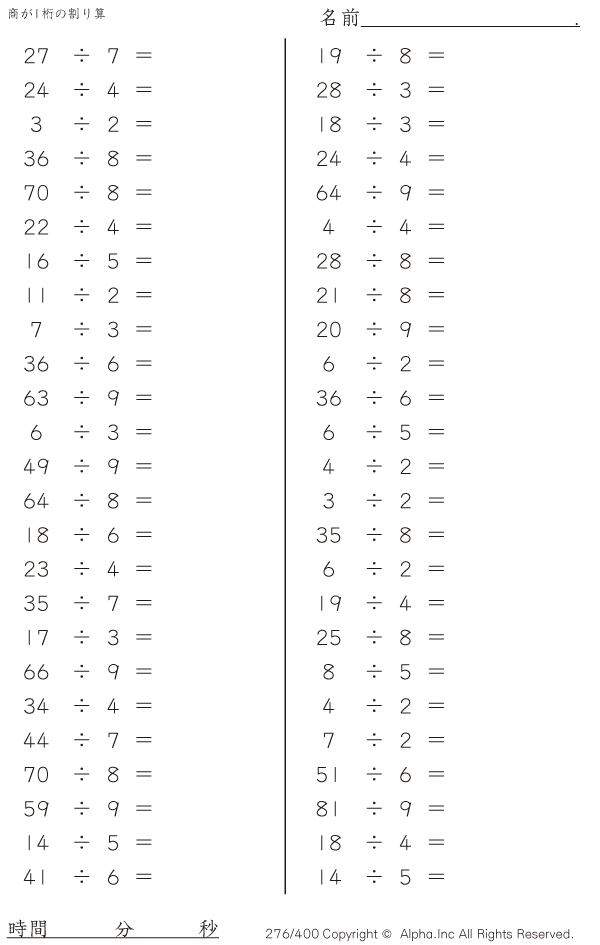 上記のボタンから「商が1桁の割り算」の算数数学ドリル・計算ドリル(PDFプリント)がダウンロードできます。個人利用は無料です(家庭以外での配布は有料です)。
