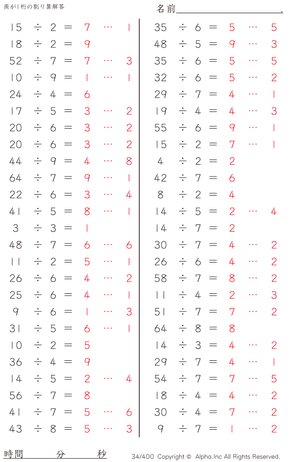 上記のボタンから「商が1桁の割り算」の算数数学ドリル・計算ドリル(PDFプリント)がダウンロードできます。個人利用は無料です(家庭以外での配布は有料です)。