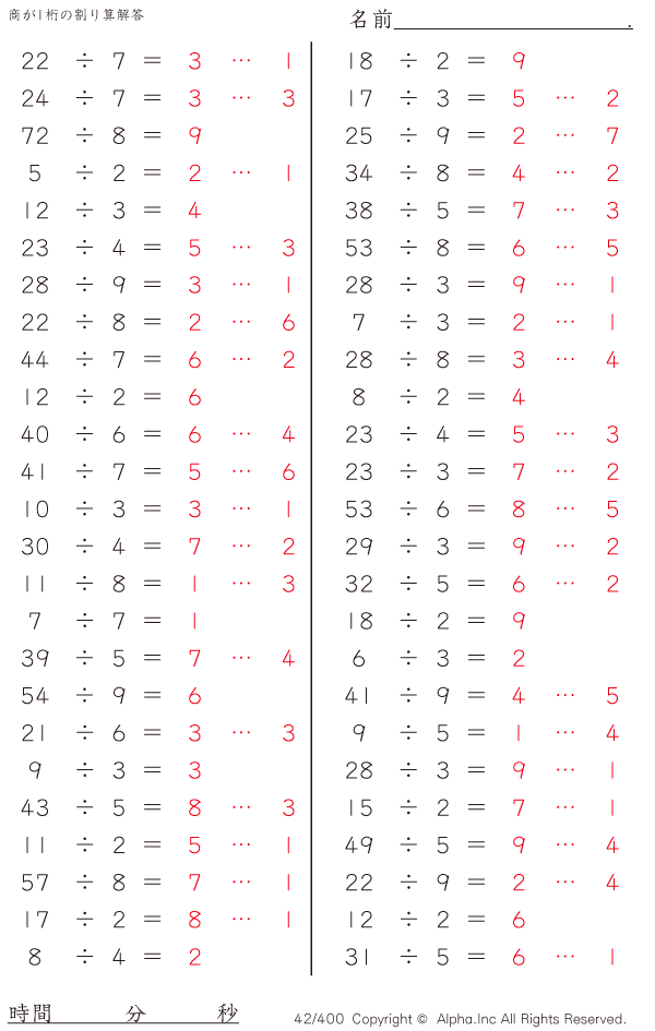 上記のボタンから「商が1桁の割り算」の算数数学ドリル・計算ドリル(PDFプリント)がダウンロードできます。個人利用は無料です(家庭以外での配布は有料です)。