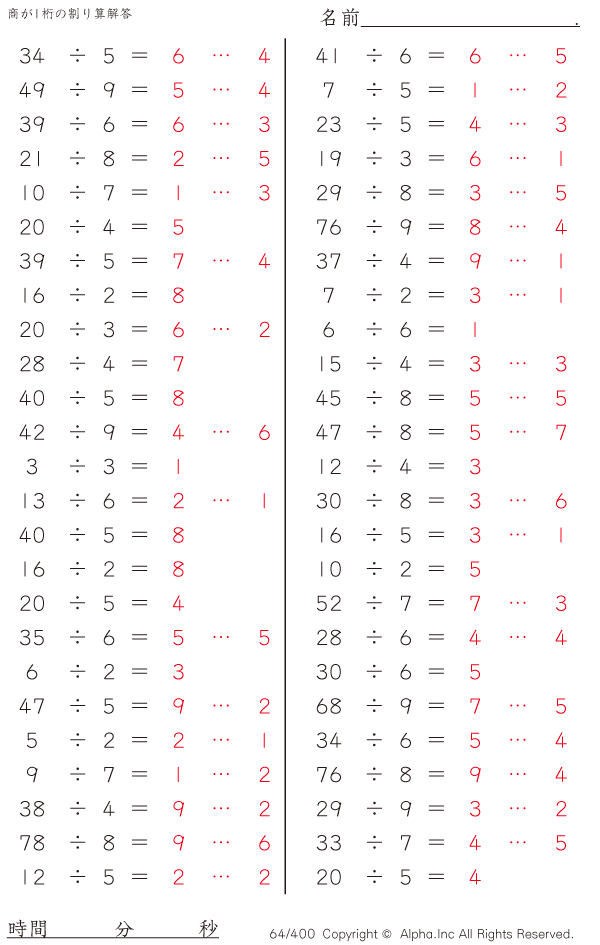 上記のボタンから「商が1桁の割り算」の算数数学ドリル・計算ドリル(PDFプリント)がダウンロードできます。個人利用は無料です(家庭以外での配布は有料です)。