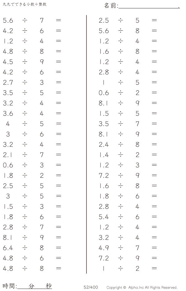 上記のボタンから「九九を使う1桁の小数÷整数」の算数数学ドリル・計算ドリル(PDFプリント)がダウンロードできます。個人利用は無料です(家庭以外での配布は有料です)。