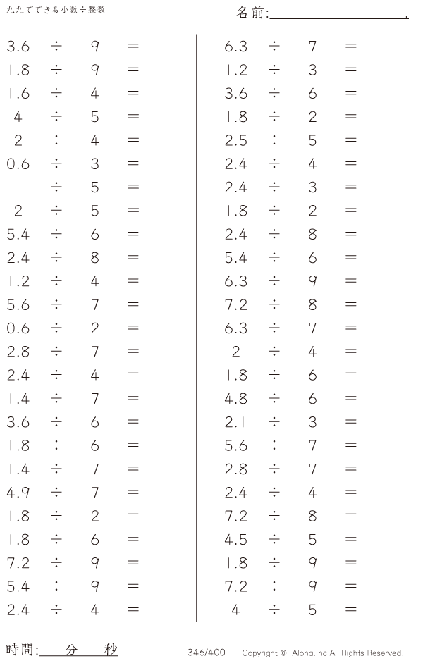 上記のボタンから「九九を使う1桁の小数÷整数」の算数数学ドリル・計算ドリル(PDFプリント)がダウンロードできます。個人利用は無料です(家庭以外での配布は有料です)。