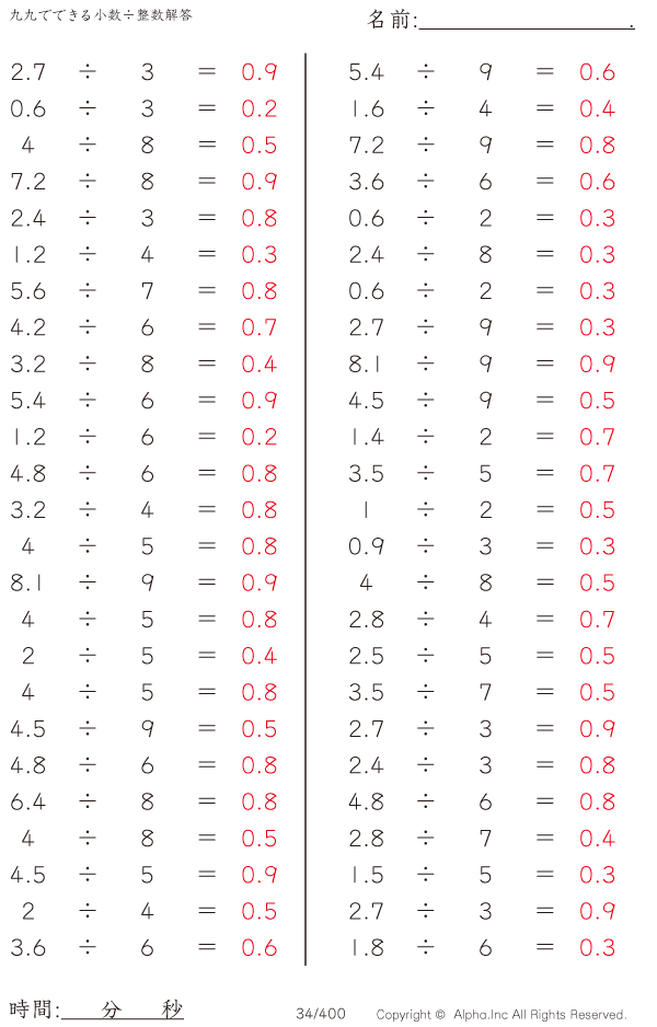 上記のボタンから「九九を使う1桁の小数÷整数」の算数数学ドリル・計算ドリル(PDFプリント)がダウンロードできます。個人利用は無料です(家庭以外での配布は有料です)。