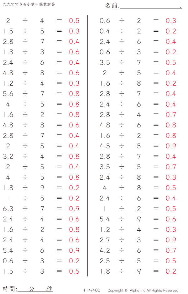 上記のボタンから「九九を使う1桁の小数÷整数」の算数数学ドリル・計算ドリル(PDFプリント)がダウンロードできます。個人利用は無料です(家庭以外での配布は有料です)。