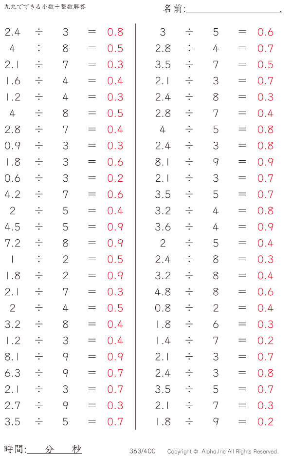 上記のボタンから「九九を使う1桁の小数÷整数」の算数数学ドリル・計算ドリル(PDFプリント)がダウンロードできます。個人利用は無料です(家庭以外での配布は有料です)。