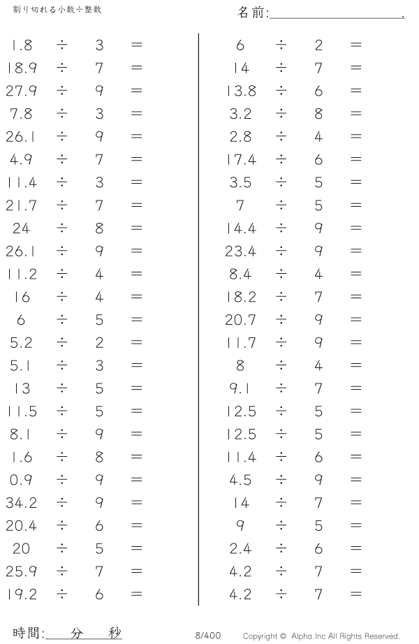 上記のボタンから「割り切れる小数÷整数」の算数数学ドリル・計算ドリル(PDFプリント)がダウンロードできます。個人利用は無料です(家庭以外での配布は有料です)。