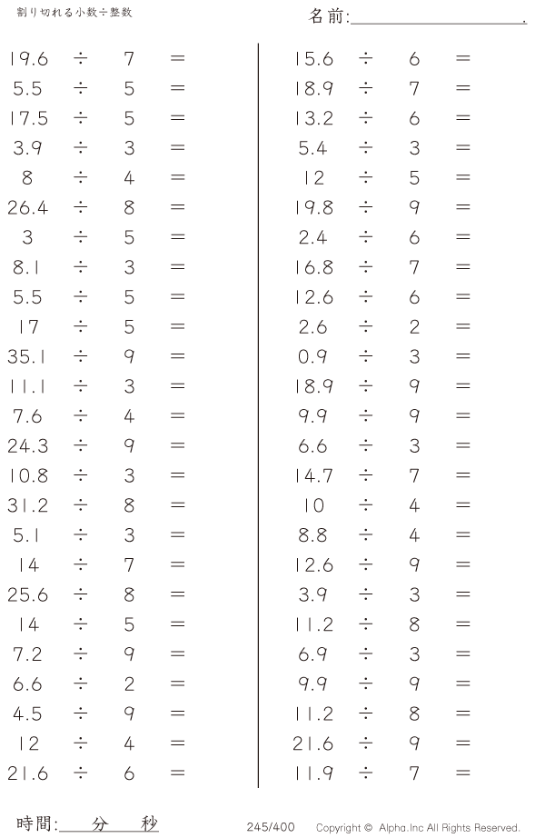 上記のボタンから「割り切れる小数÷整数」の算数数学ドリル・計算ドリル(PDFプリント)がダウンロードできます。個人利用は無料です(家庭以外での配布は有料です)。