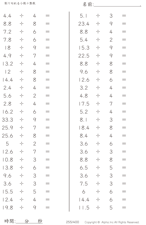 上記のボタンから「割り切れる小数÷整数」の算数数学ドリル・計算ドリル(PDFプリント)がダウンロードできます。個人利用は無料です(家庭以外での配布は有料です)。