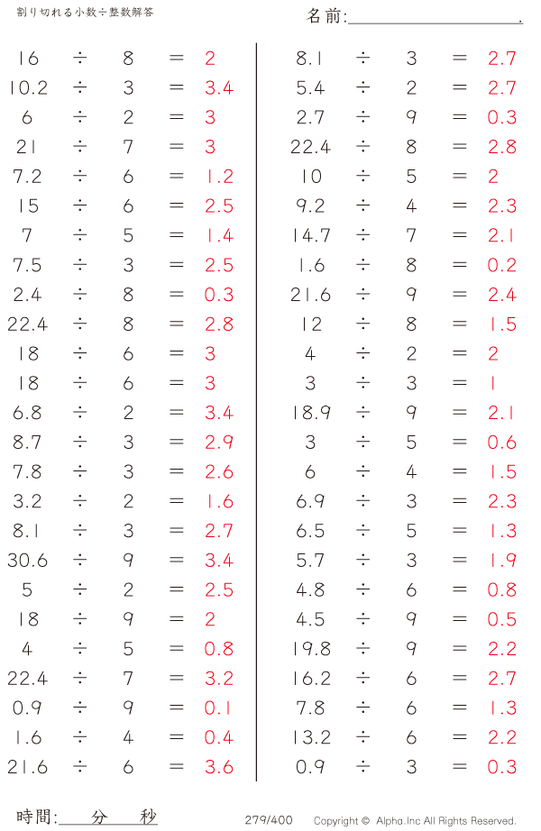 上記のボタンから「割り切れる小数÷整数」の算数数学ドリル・計算ドリル(PDFプリント)がダウンロードできます。個人利用は無料です(家庭以外での配布は有料です)。