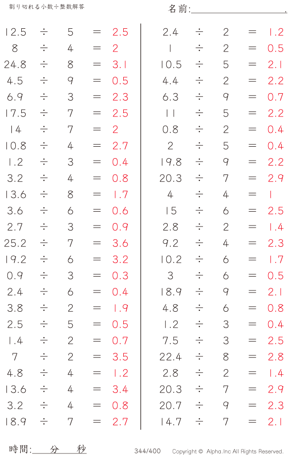 上記のボタンから「割り切れる小数÷整数」の算数数学ドリル・計算ドリル(PDFプリント)がダウンロードできます。個人利用は無料です(家庭以外での配布は有料です)。