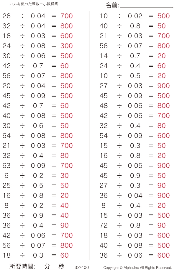 上記のボタンから「九九を使う整数÷小数」の算数数学ドリル・計算ドリル(PDFプリント)がダウンロードできます。個人利用は無料です(家庭以外での配布は有料です)。