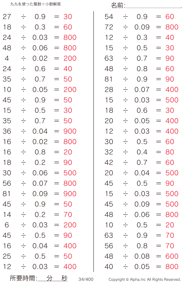 上記のボタンから「九九を使う整数÷小数」の算数数学ドリル・計算ドリル(PDFプリント)がダウンロードできます。個人利用は無料です(家庭以外での配布は有料です)。
