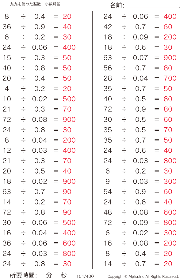 上記のボタンから「九九を使う整数÷小数」の算数数学ドリル・計算ドリル(PDFプリント)がダウンロードできます。個人利用は無料です(家庭以外での配布は有料です)。