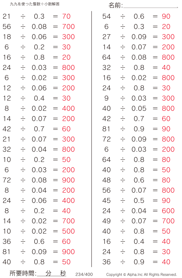 上記のボタンから「九九を使う整数÷小数」の算数数学ドリル・計算ドリル(PDFプリント)がダウンロードできます。個人利用は無料です(家庭以外での配布は有料です)。