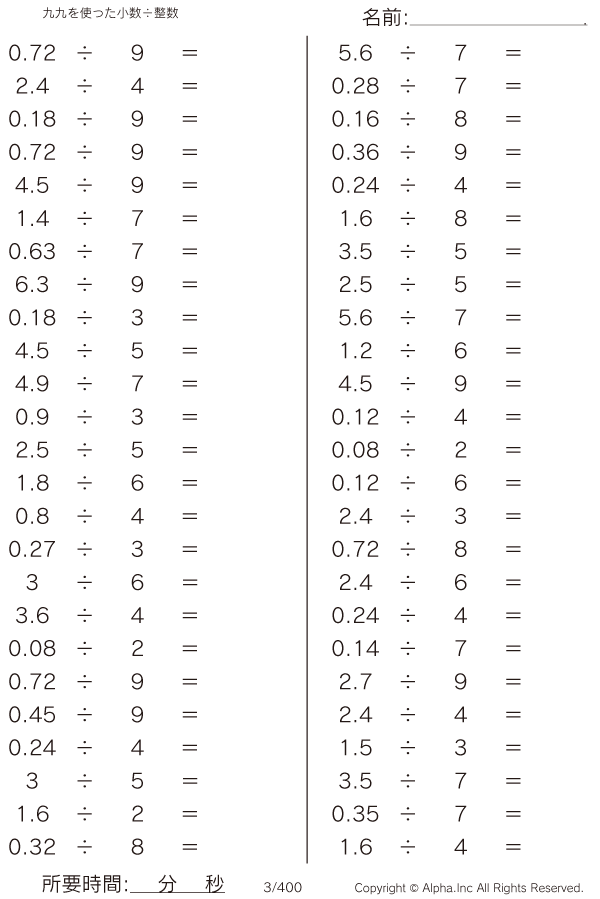 上記のボタンから「九九を使う小数÷整数」の算数数学ドリル・計算ドリル(PDFプリント)がダウンロードできます。個人利用は無料です(家庭以外での配布は有料です)。