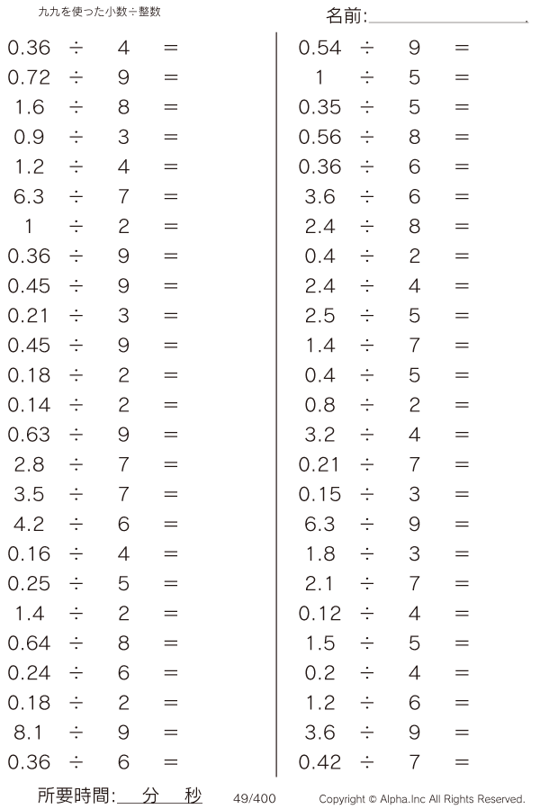 上記のボタンから「九九を使う小数÷整数」の算数数学ドリル・計算ドリル(PDFプリント)がダウンロードできます。個人利用は無料です(家庭以外での配布は有料です)。