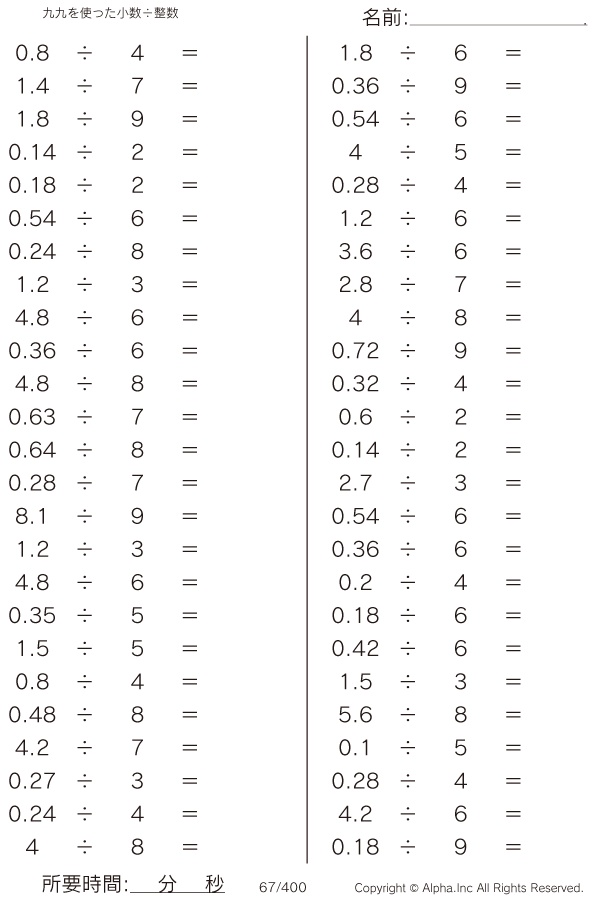 上記のボタンから「九九を使う小数÷整数」の算数数学ドリル・計算ドリル(PDFプリント)がダウンロードできます。個人利用は無料です(家庭以外での配布は有料です)。