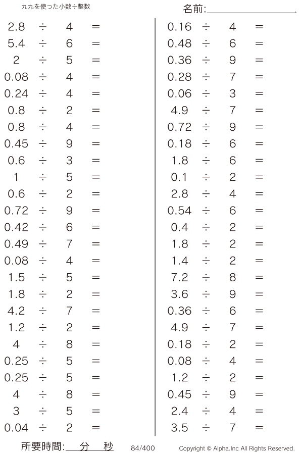 上記のボタンから「九九を使う小数÷整数」の算数数学ドリル・計算ドリル(PDFプリント)がダウンロードできます。個人利用は無料です(家庭以外での配布は有料です)。