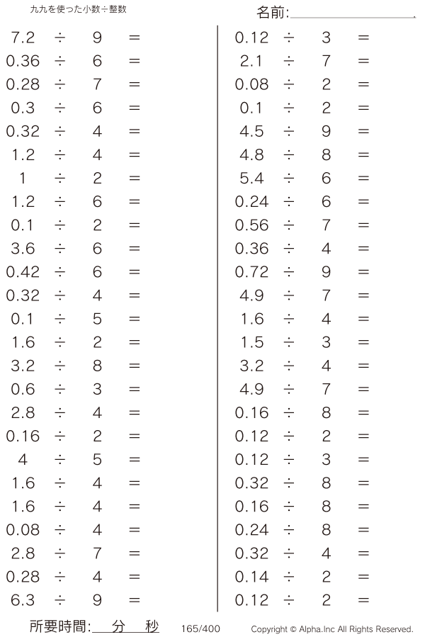 上記のボタンから「九九を使う小数÷整数」の算数数学ドリル・計算ドリル(PDFプリント)がダウンロードできます。個人利用は無料です(家庭以外での配布は有料です)。
