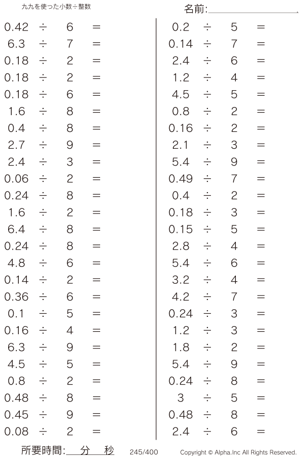 上記のボタンから「九九を使う小数÷整数」の算数数学ドリル・計算ドリル(PDFプリント)がダウンロードできます。個人利用は無料です(家庭以外での配布は有料です)。