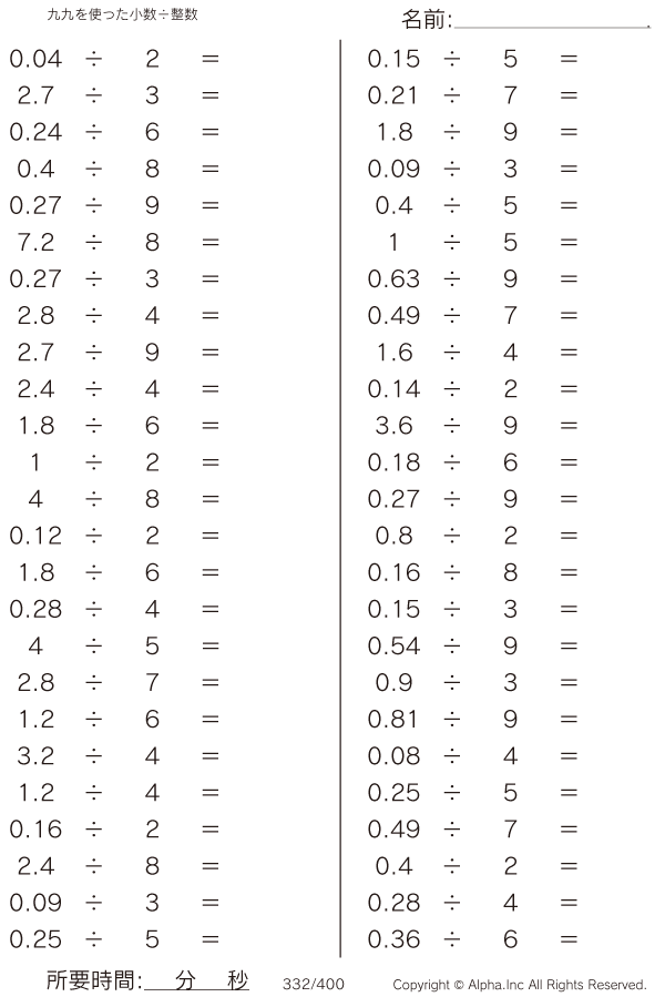 上記のボタンから「九九を使う小数÷整数」の算数数学ドリル・計算ドリル(PDFプリント)がダウンロードできます。個人利用は無料です(家庭以外での配布は有料です)。