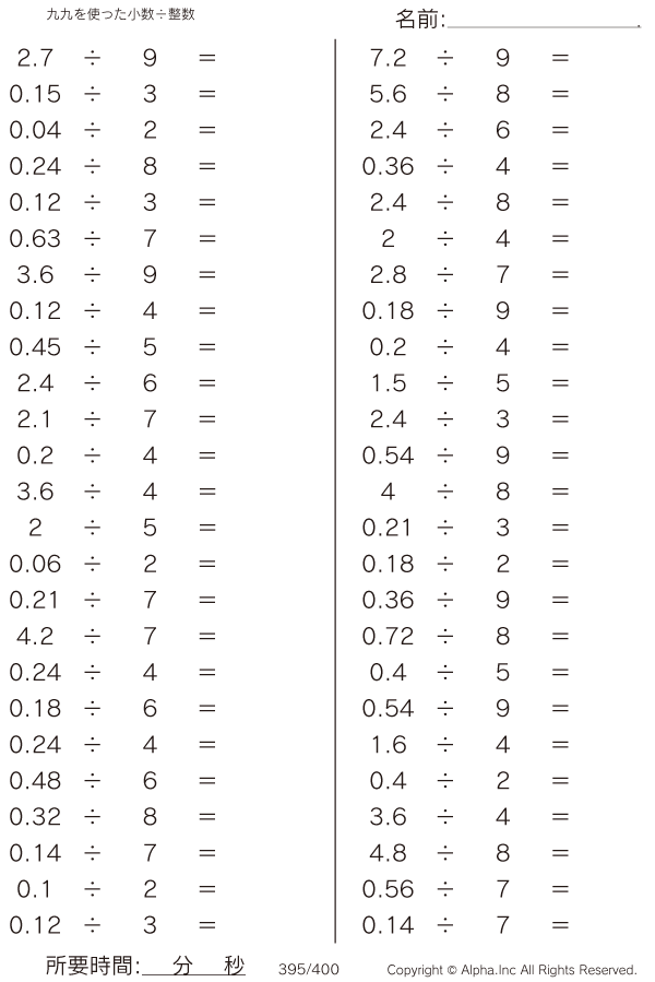 上記のボタンから「九九を使う小数÷整数」の算数数学ドリル・計算ドリル(PDFプリント)がダウンロードできます。個人利用は無料です(家庭以外での配布は有料です)。